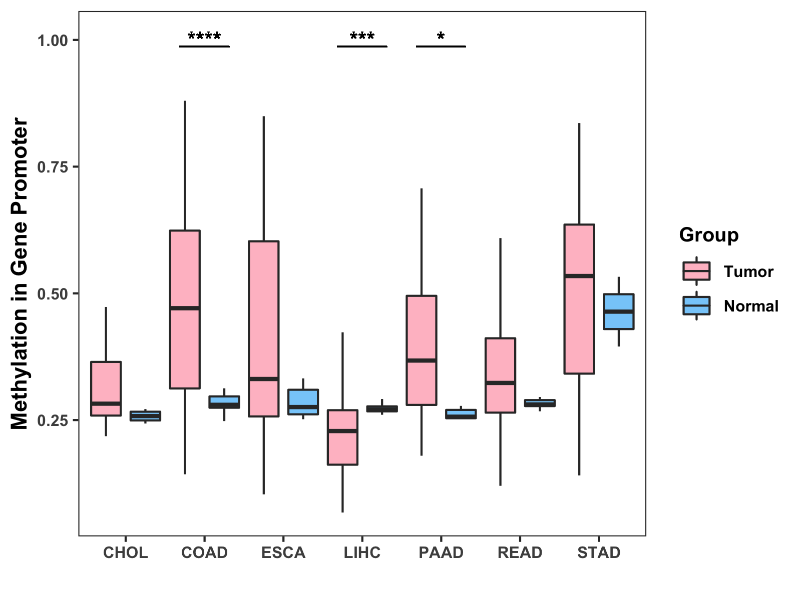 Boxplot of All Gastrointestinal Cancer ( * : 0.01-0.05 , ** : 0.005-0.01 , *** : 0.0001-0.005 , **** : < 0.0001 ) |