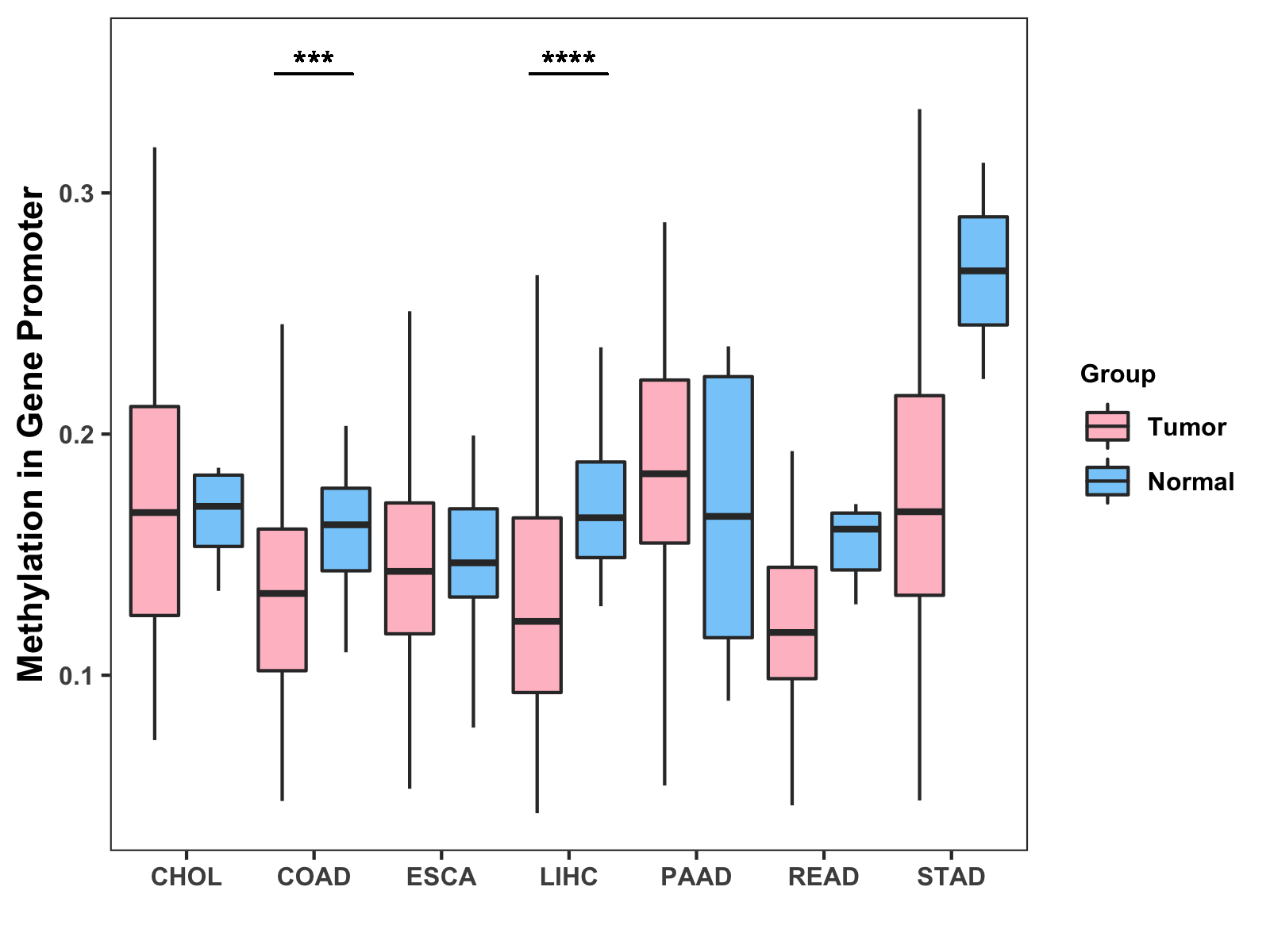 Boxplot of All Gastrointestinal Cancer ( * : 0.01-0.05 , ** : 0.005-0.01 , *** : 0.0001-0.005 , **** : < 0.0001 ) |