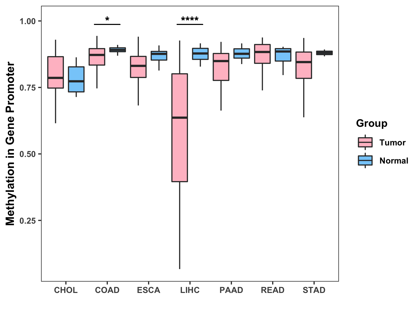Boxplot of All Gastrointestinal Cancer ( * : 0.01-0.05 , ** : 0.005-0.01 , *** : 0.0001-0.005 , **** : < 0.0001 ) |