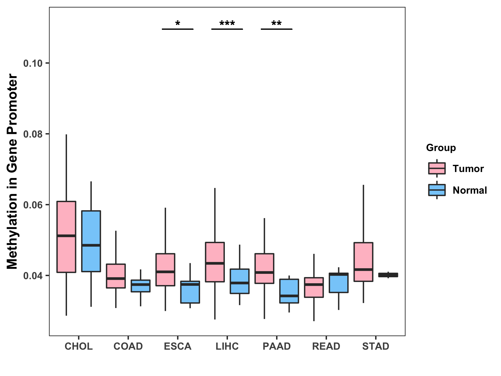 Boxplot of All Gastrointestinal Cancer ( * : 0.01-0.05 , ** : 0.005-0.01 , *** : 0.0001-0.005 , **** : < 0.0001 ) |