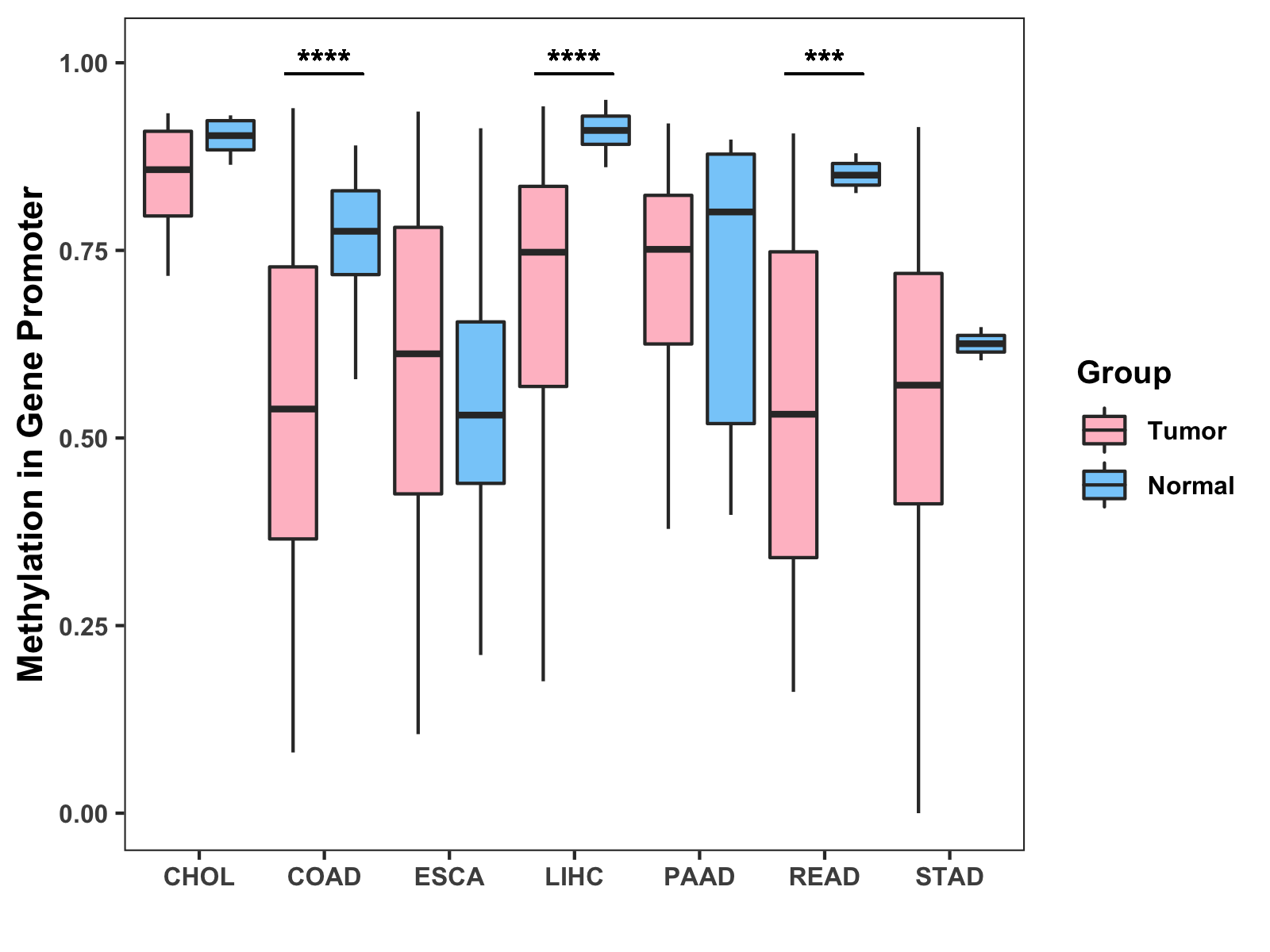 Boxplot of All Gastrointestinal Cancer ( * : 0.01-0.05 , ** : 0.005-0.01 , *** : 0.0001-0.005 , **** : < 0.0001 ) |