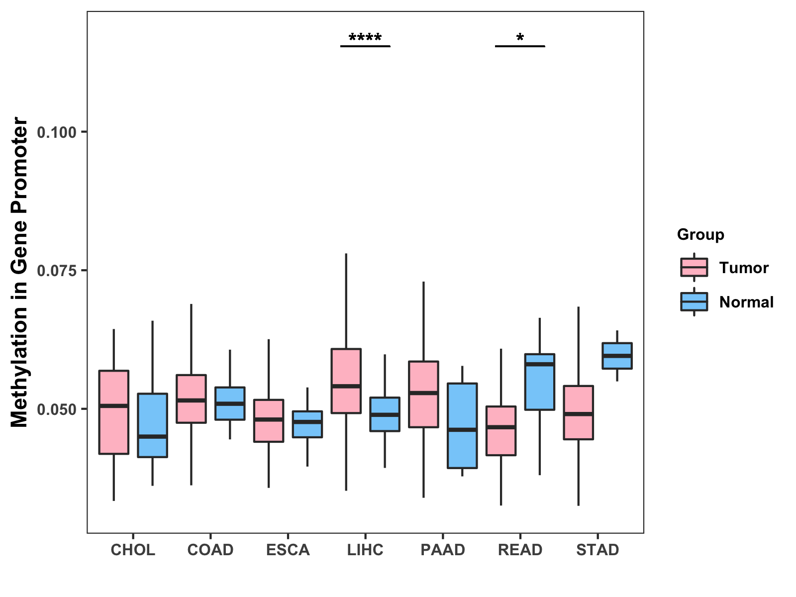 Boxplot of All Gastrointestinal Cancer ( * : 0.01-0.05 , ** : 0.005-0.01 , *** : 0.0001-0.005 , **** : < 0.0001 ) |