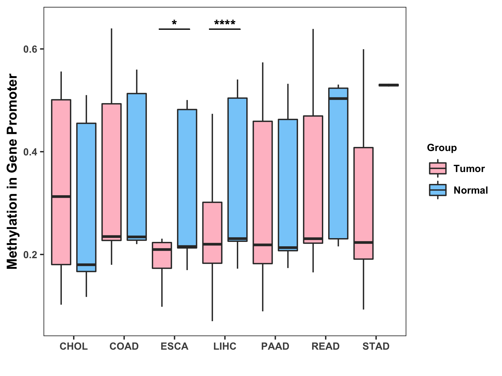 Boxplot of All Gastrointestinal Cancer ( * : 0.01-0.05 , ** : 0.005-0.01 , *** : 0.0001-0.005 , **** : < 0.0001 ) |
