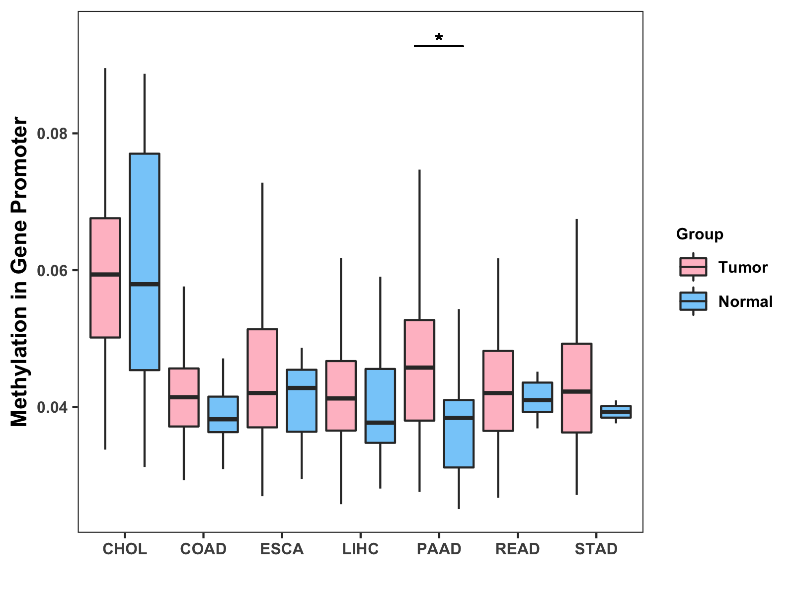 Boxplot of All Gastrointestinal Cancer ( * : 0.01-0.05 , ** : 0.005-0.01 , *** : 0.0001-0.005 , **** : < 0.0001 ) |