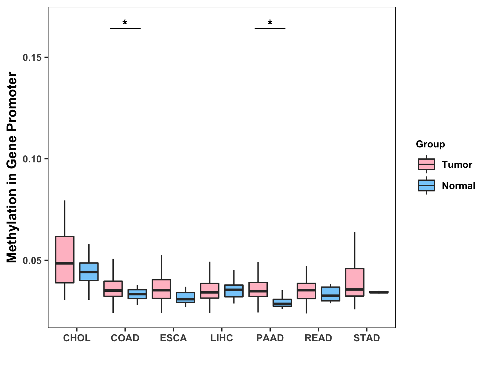 Boxplot of All Gastrointestinal Cancer ( * : 0.01-0.05 , ** : 0.005-0.01 , *** : 0.0001-0.005 , **** : < 0.0001 ) |