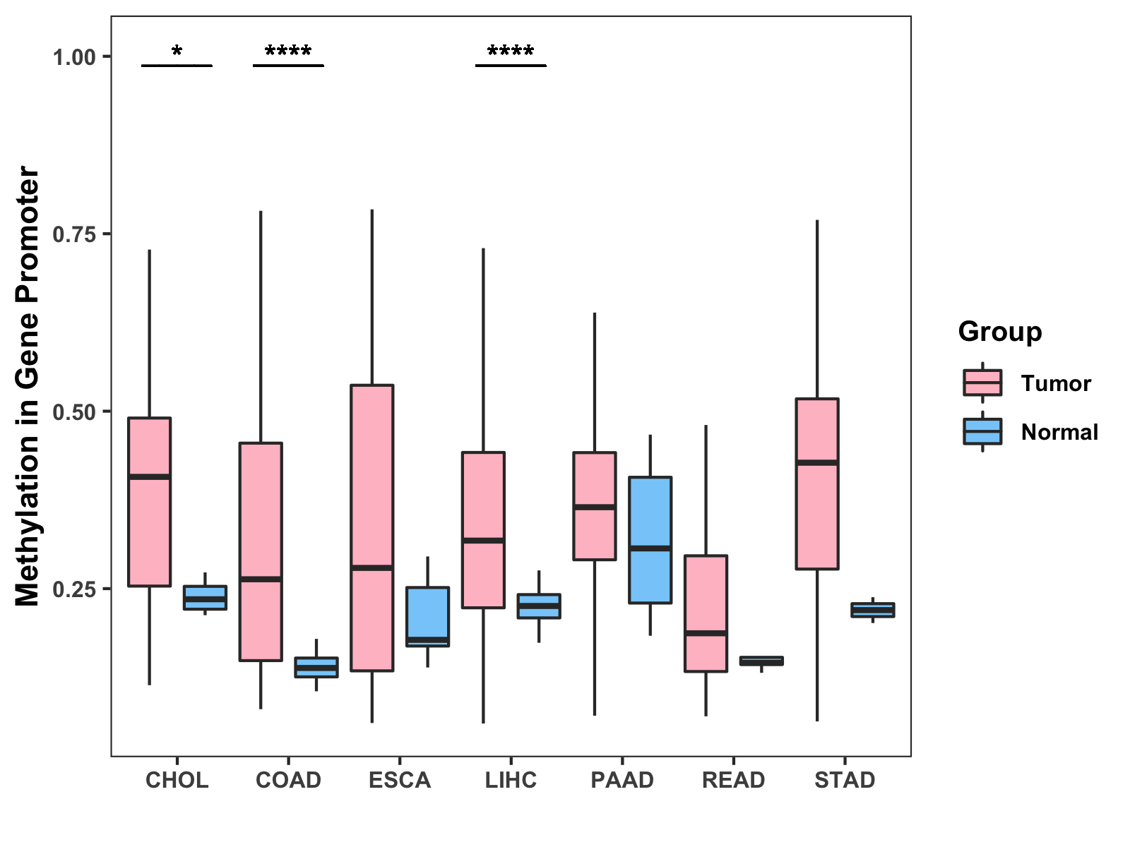 Boxplot of All Gastrointestinal Cancer ( * : 0.01-0.05 , ** : 0.005-0.01 , *** : 0.0001-0.005 , **** : < 0.0001 ) |