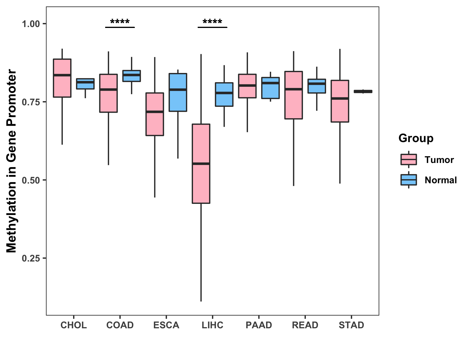 Boxplot of All Gastrointestinal Cancer ( * : 0.01-0.05 , ** : 0.005-0.01 , *** : 0.0001-0.005 , **** : < 0.0001 ) |