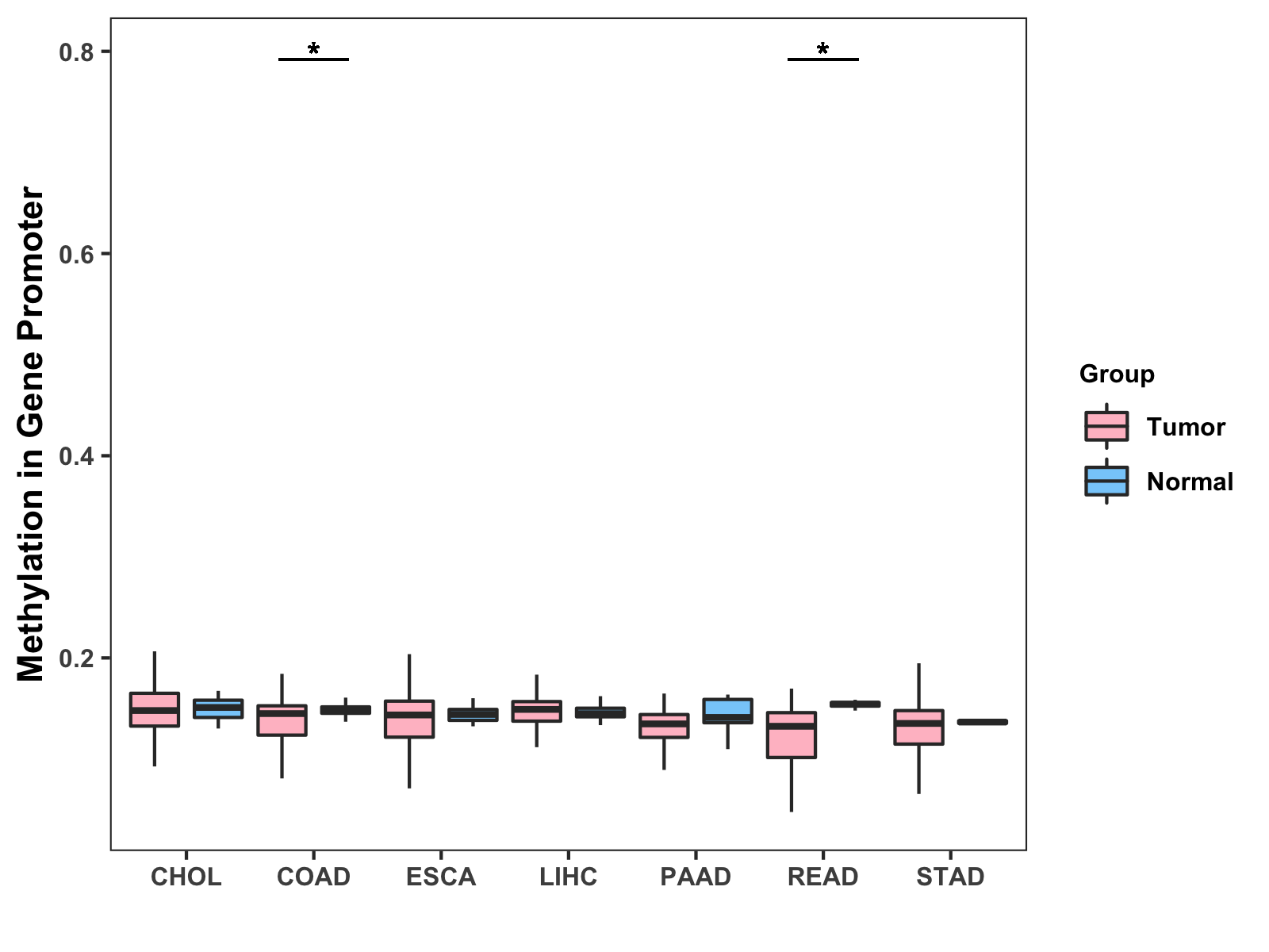 Boxplot of All Gastrointestinal Cancer ( * : 0.01-0.05 , ** : 0.005-0.01 , *** : 0.0001-0.005 , **** : < 0.0001 ) |