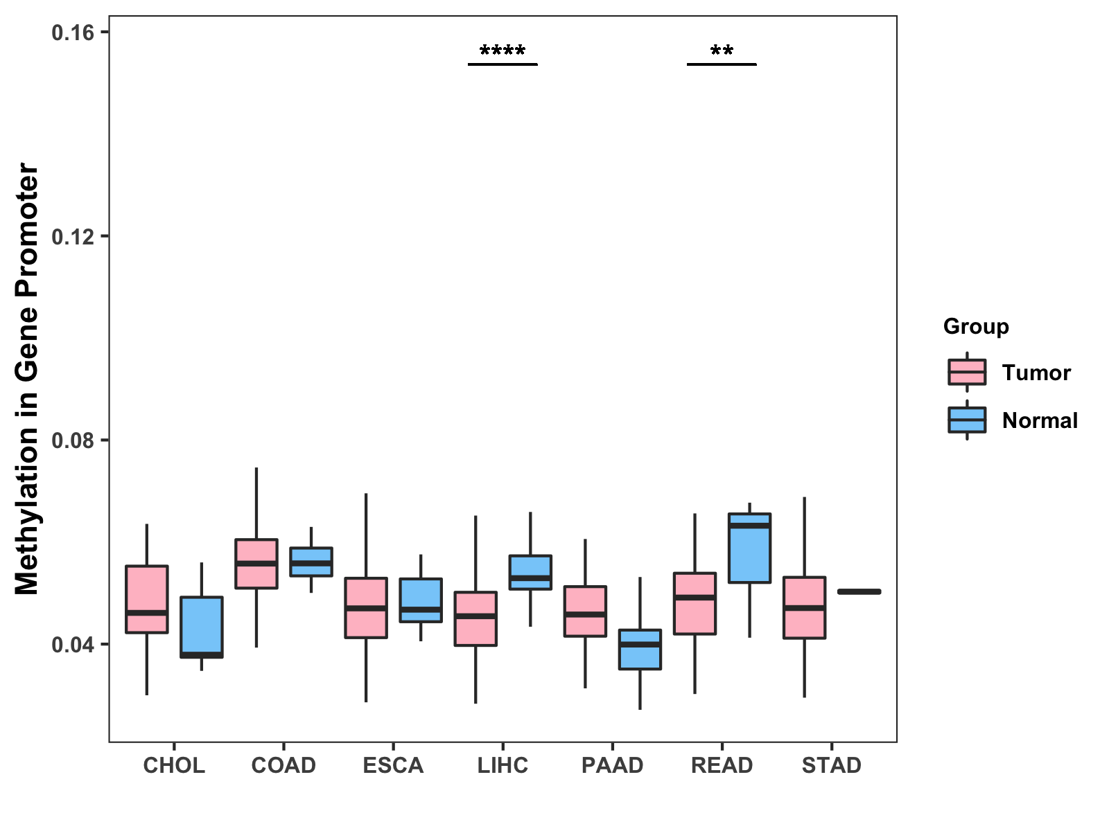 Boxplot of All Gastrointestinal Cancer ( * : 0.01-0.05 , ** : 0.005-0.01 , *** : 0.0001-0.005 , **** : < 0.0001 ) |