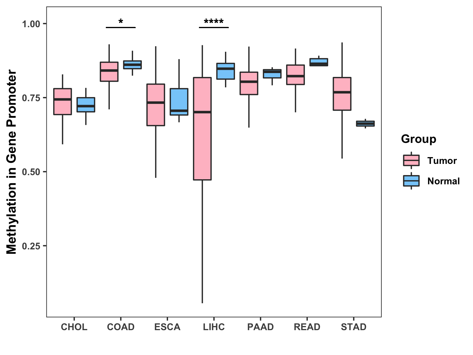 Boxplot of All Gastrointestinal Cancer ( * : 0.01-0.05 , ** : 0.005-0.01 , *** : 0.0001-0.005 , **** : < 0.0001 ) |