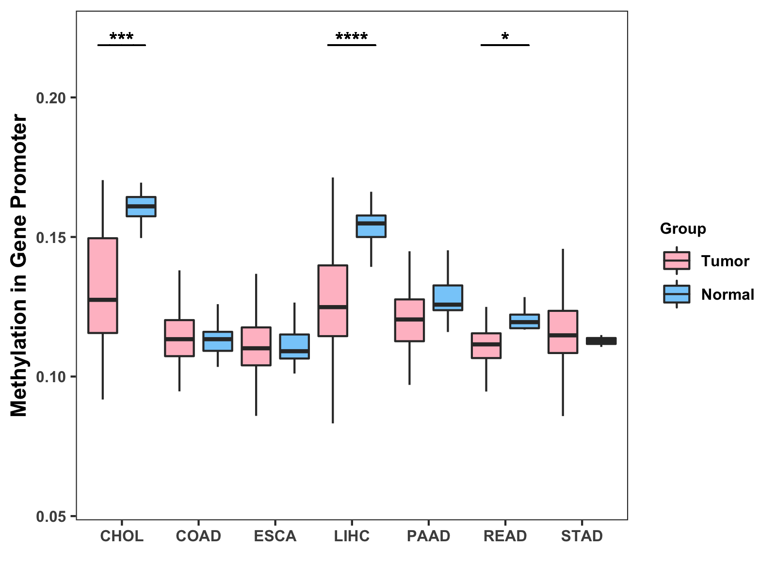 Boxplot of All Gastrointestinal Cancer ( * : 0.01-0.05 , ** : 0.005-0.01 , *** : 0.0001-0.005 , **** : < 0.0001 ) |