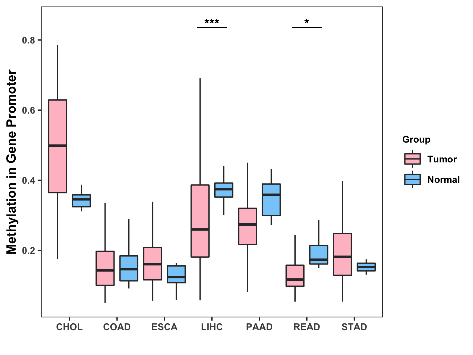 Boxplot of All Gastrointestinal Cancer ( * : 0.01-0.05 , ** : 0.005-0.01 , *** : 0.0001-0.005 , **** : < 0.0001 ) |