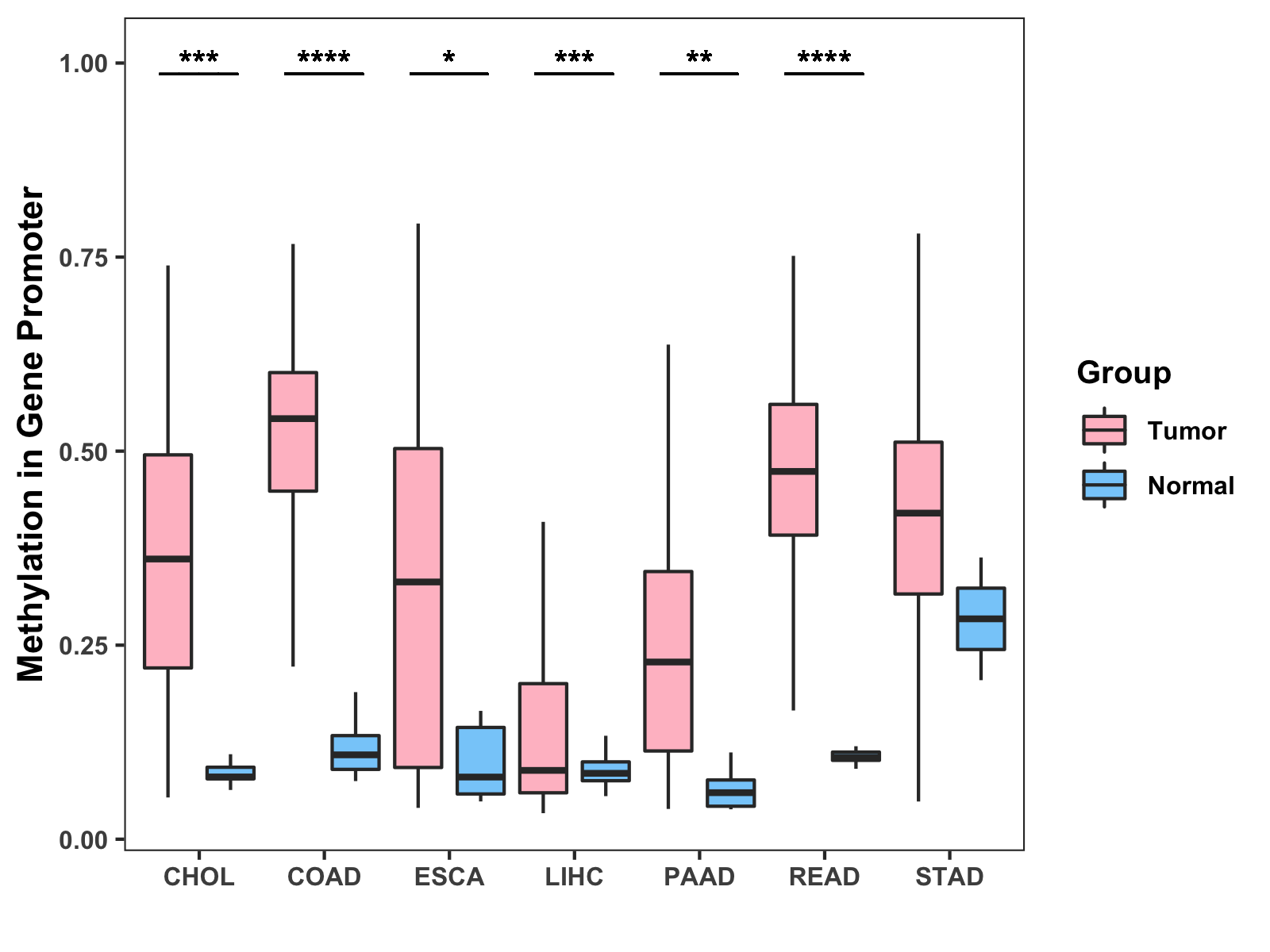 Boxplot of All Gastrointestinal Cancer ( * : 0.01-0.05 , ** : 0.005-0.01 , *** : 0.0001-0.005 , **** : < 0.0001 ) |