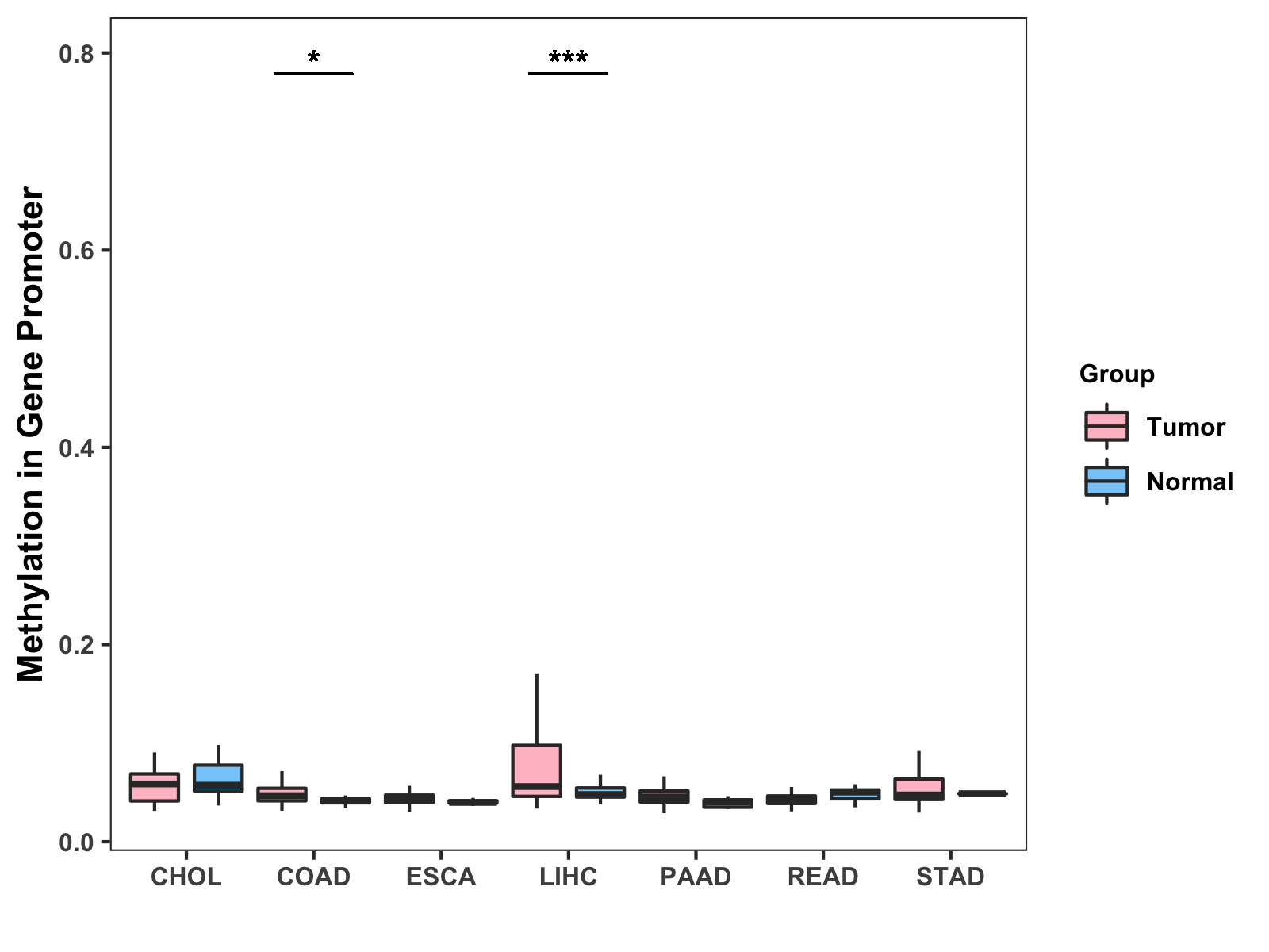Boxplot of All Gastrointestinal Cancer ( * : 0.01-0.05 , ** : 0.005-0.01 , *** : 0.0001-0.005 , **** : < 0.0001 ) |