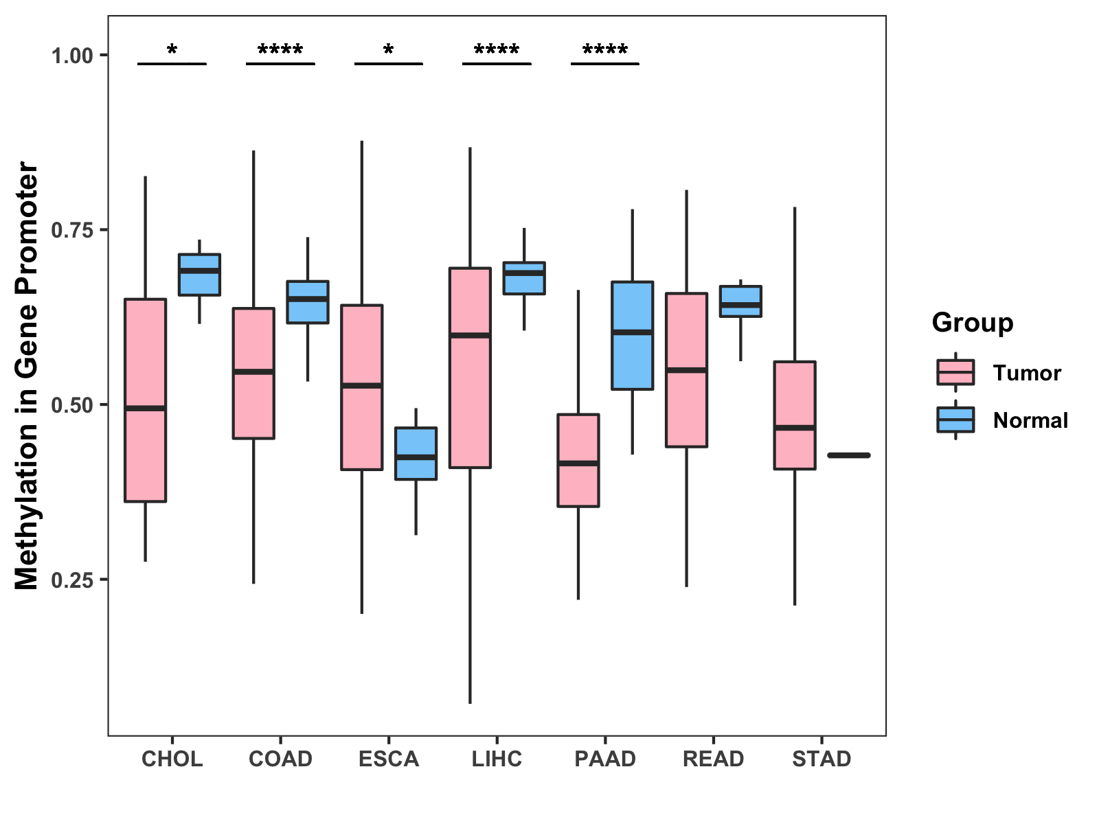 Boxplot of All Gastrointestinal Cancer ( * : 0.01-0.05 , ** : 0.005-0.01 , *** : 0.0001-0.005 , **** : < 0.0001 ) |