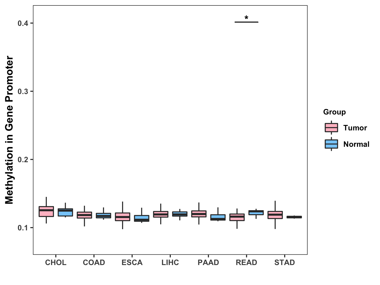 Boxplot of All Gastrointestinal Cancer ( * : 0.01-0.05 , ** : 0.005-0.01 , *** : 0.0001-0.005 , **** : < 0.0001 ) |