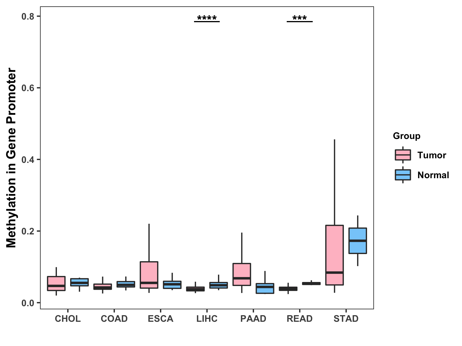 Boxplot of All Gastrointestinal Cancer ( * : 0.01-0.05 , ** : 0.005-0.01 , *** : 0.0001-0.005 , **** : < 0.0001 ) |