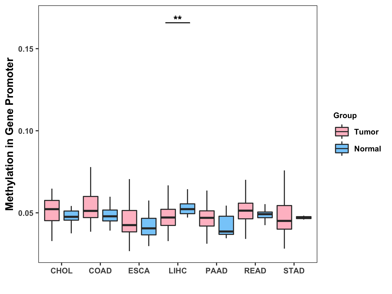 Boxplot of All Gastrointestinal Cancer ( * : 0.01-0.05 , ** : 0.005-0.01 , *** : 0.0001-0.005 , **** : < 0.0001 ) |