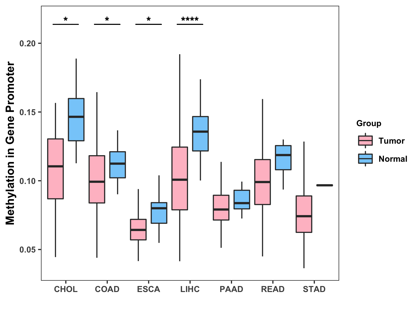 Boxplot of All Gastrointestinal Cancer ( * : 0.01-0.05 , ** : 0.005-0.01 , *** : 0.0001-0.005 , **** : < 0.0001 ) |