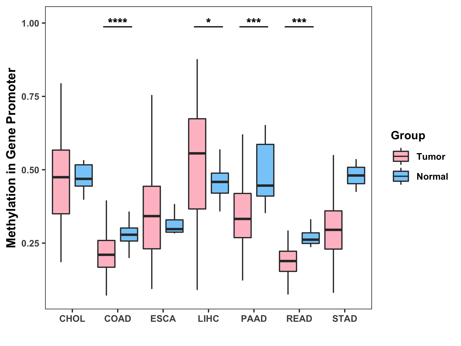 Boxplot of All Gastrointestinal Cancer ( * : 0.01-0.05 , ** : 0.005-0.01 , *** : 0.0001-0.005 , **** : < 0.0001 ) |