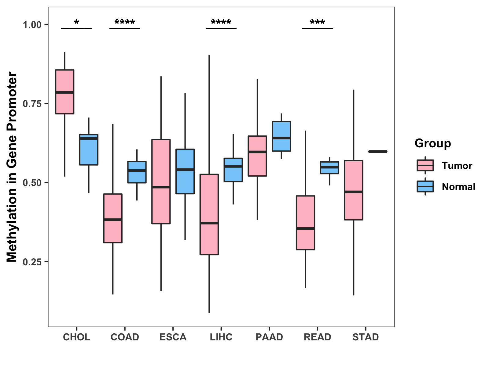 Boxplot of All Gastrointestinal Cancer ( * : 0.01-0.05 , ** : 0.005-0.01 , *** : 0.0001-0.005 , **** : < 0.0001 ) |