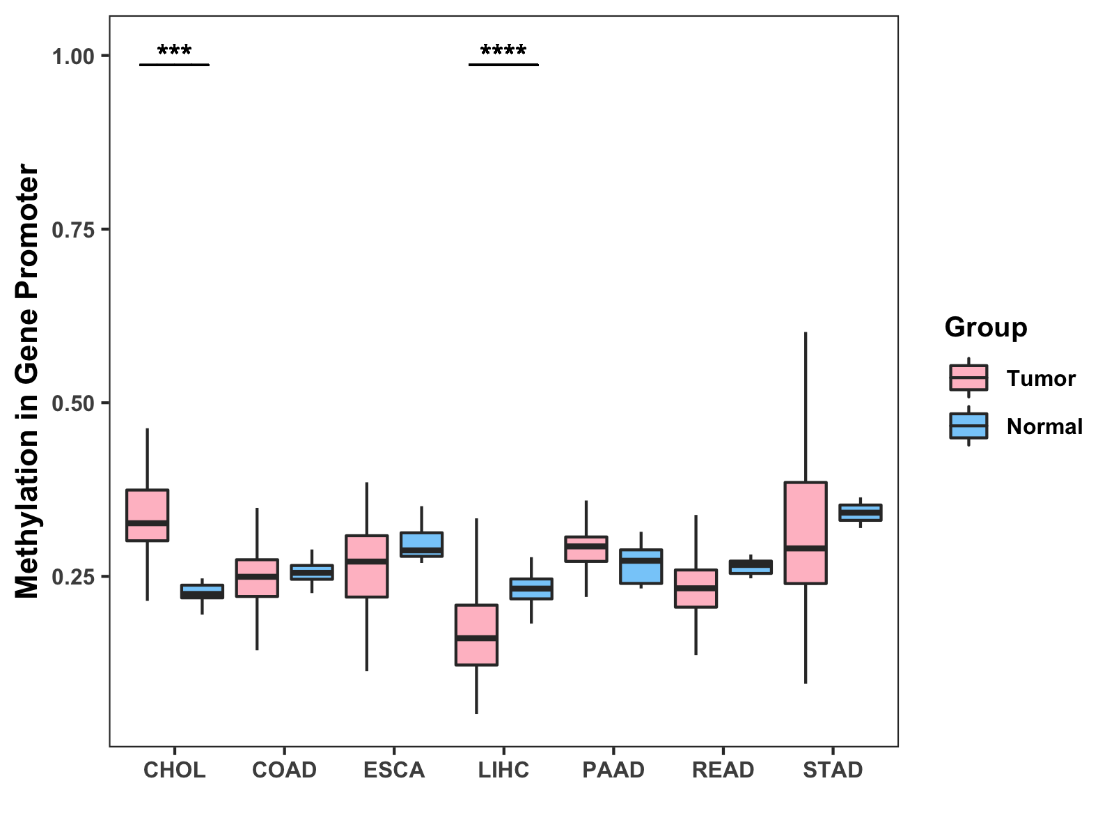 Boxplot of All Gastrointestinal Cancer ( * : 0.01-0.05 , ** : 0.005-0.01 , *** : 0.0001-0.005 , **** : < 0.0001 ) |