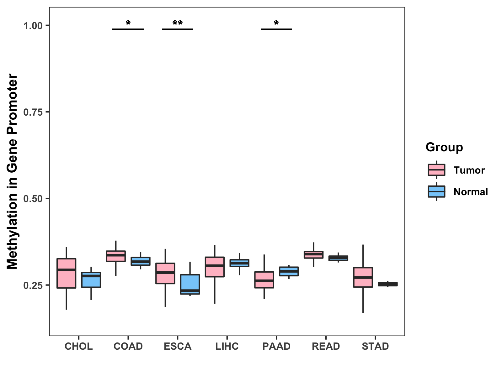 Boxplot of All Gastrointestinal Cancer ( * : 0.01-0.05 , ** : 0.005-0.01 , *** : 0.0001-0.005 , **** : < 0.0001 ) |
