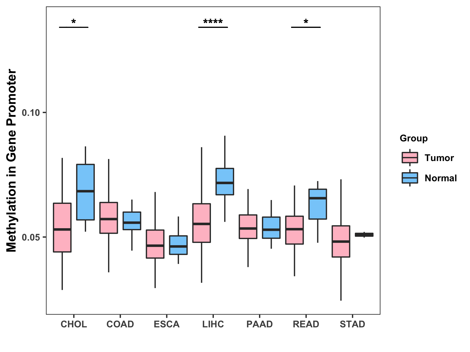 Boxplot of All Gastrointestinal Cancer ( * : 0.01-0.05 , ** : 0.005-0.01 , *** : 0.0001-0.005 , **** : < 0.0001 ) |