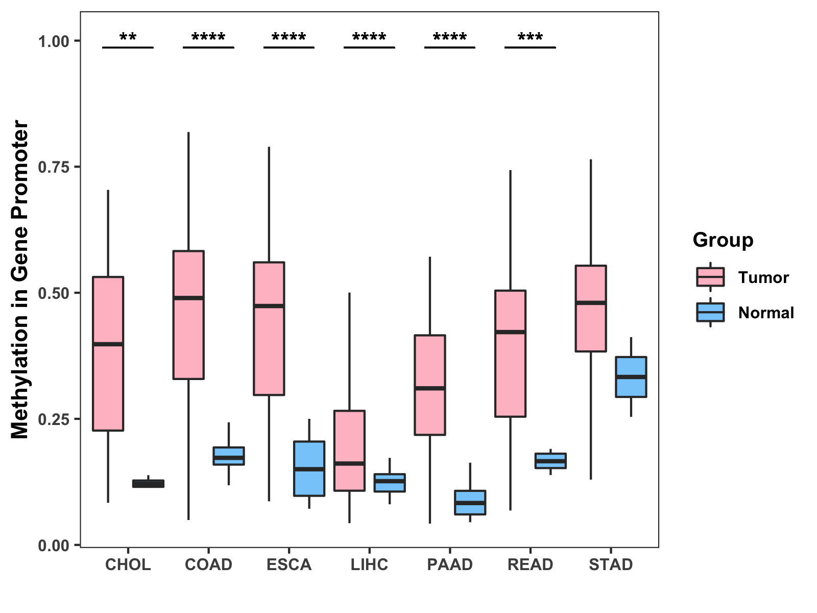 Boxplot of All Gastrointestinal Cancer ( * : 0.01-0.05 , ** : 0.005-0.01 , *** : 0.0001-0.005 , **** : < 0.0001 ) |