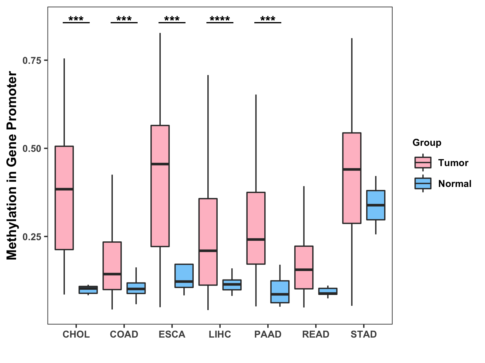 Boxplot of All Gastrointestinal Cancer ( * : 0.01-0.05 , ** : 0.005-0.01 , *** : 0.0001-0.005 , **** : < 0.0001 ) |