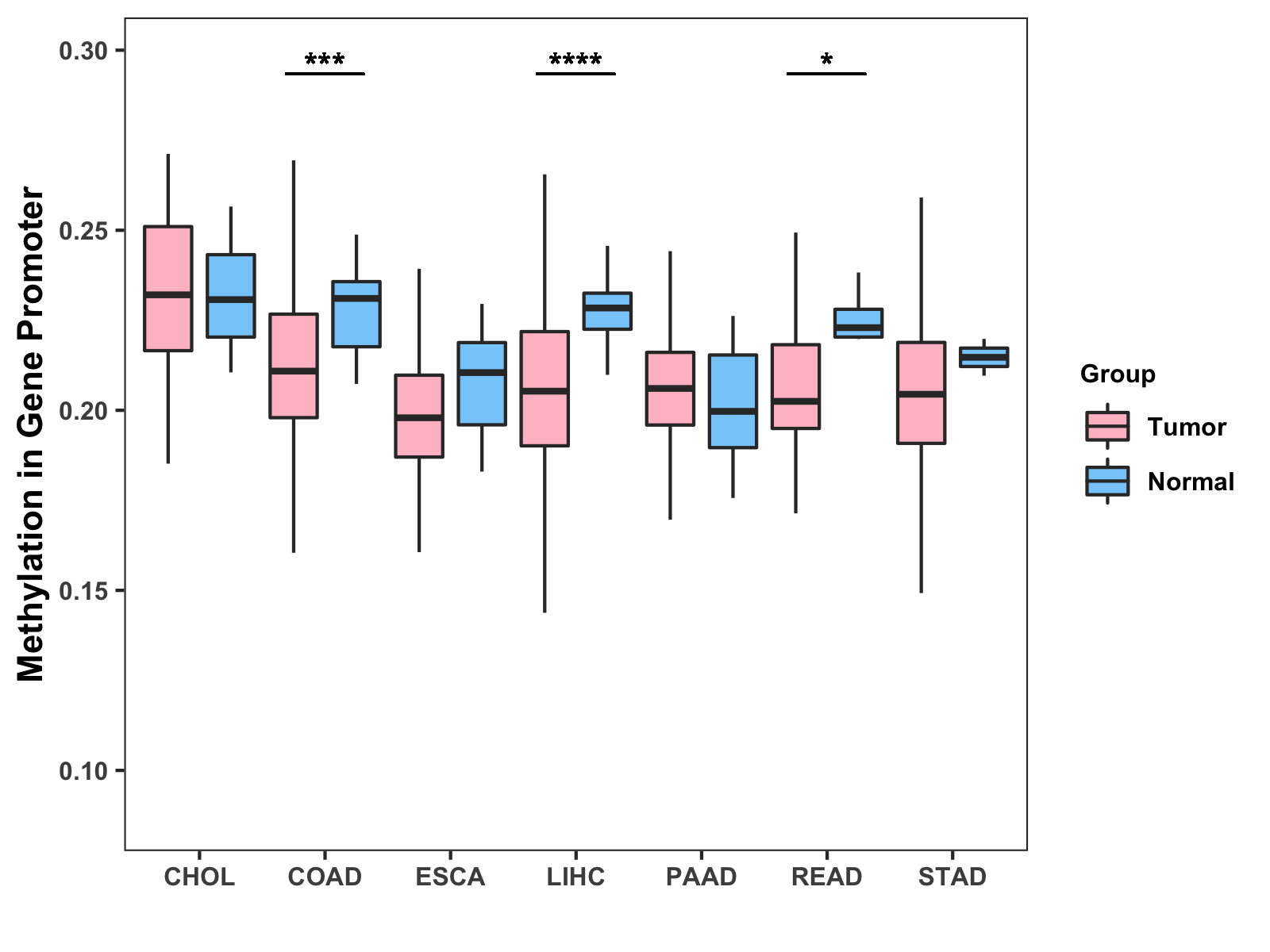 Boxplot of All Gastrointestinal Cancer ( * : 0.01-0.05 , ** : 0.005-0.01 , *** : 0.0001-0.005 , **** : < 0.0001 ) |