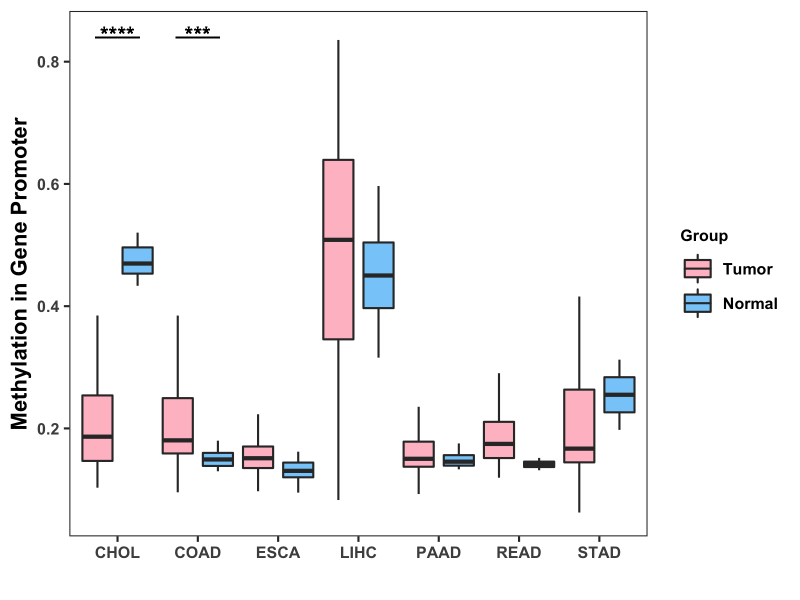 Boxplot of All Gastrointestinal Cancer ( * : 0.01-0.05 , ** : 0.005-0.01 , *** : 0.0001-0.005 , **** : < 0.0001 ) |