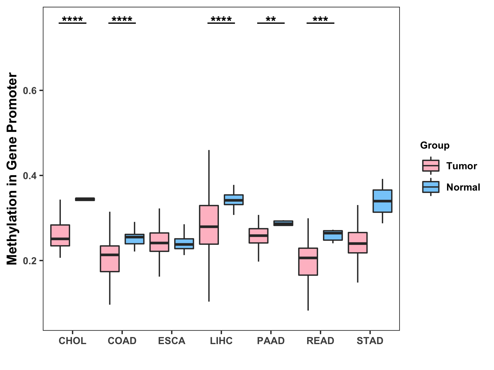 Boxplot of All Gastrointestinal Cancer ( * : 0.01-0.05 , ** : 0.005-0.01 , *** : 0.0001-0.005 , **** : < 0.0001 ) |