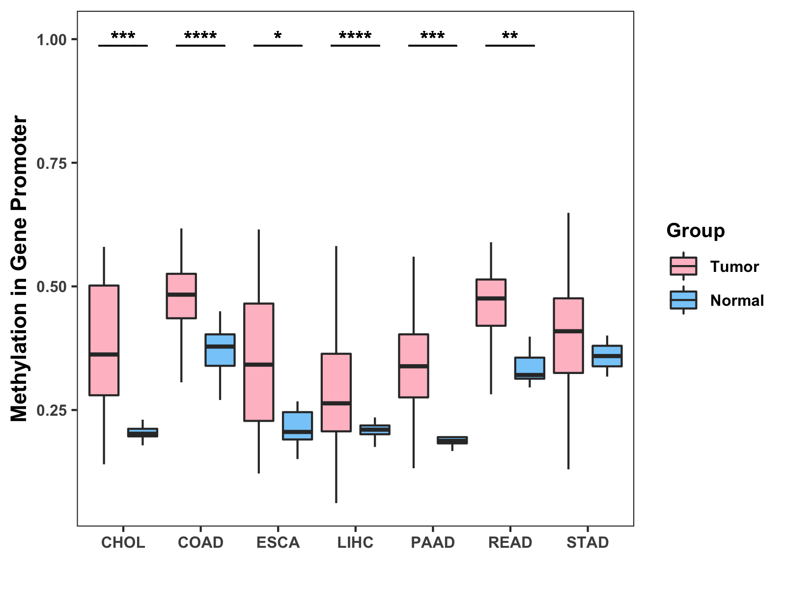 Boxplot of All Gastrointestinal Cancer ( * : 0.01-0.05 , ** : 0.005-0.01 , *** : 0.0001-0.005 , **** : < 0.0001 ) |