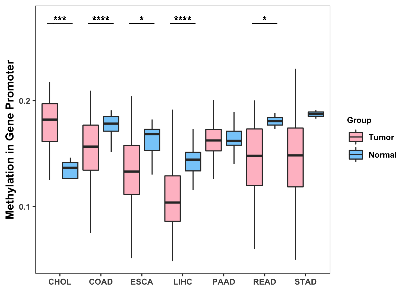 Boxplot of All Gastrointestinal Cancer ( * : 0.01-0.05 , ** : 0.005-0.01 , *** : 0.0001-0.005 , **** : < 0.0001 ) |