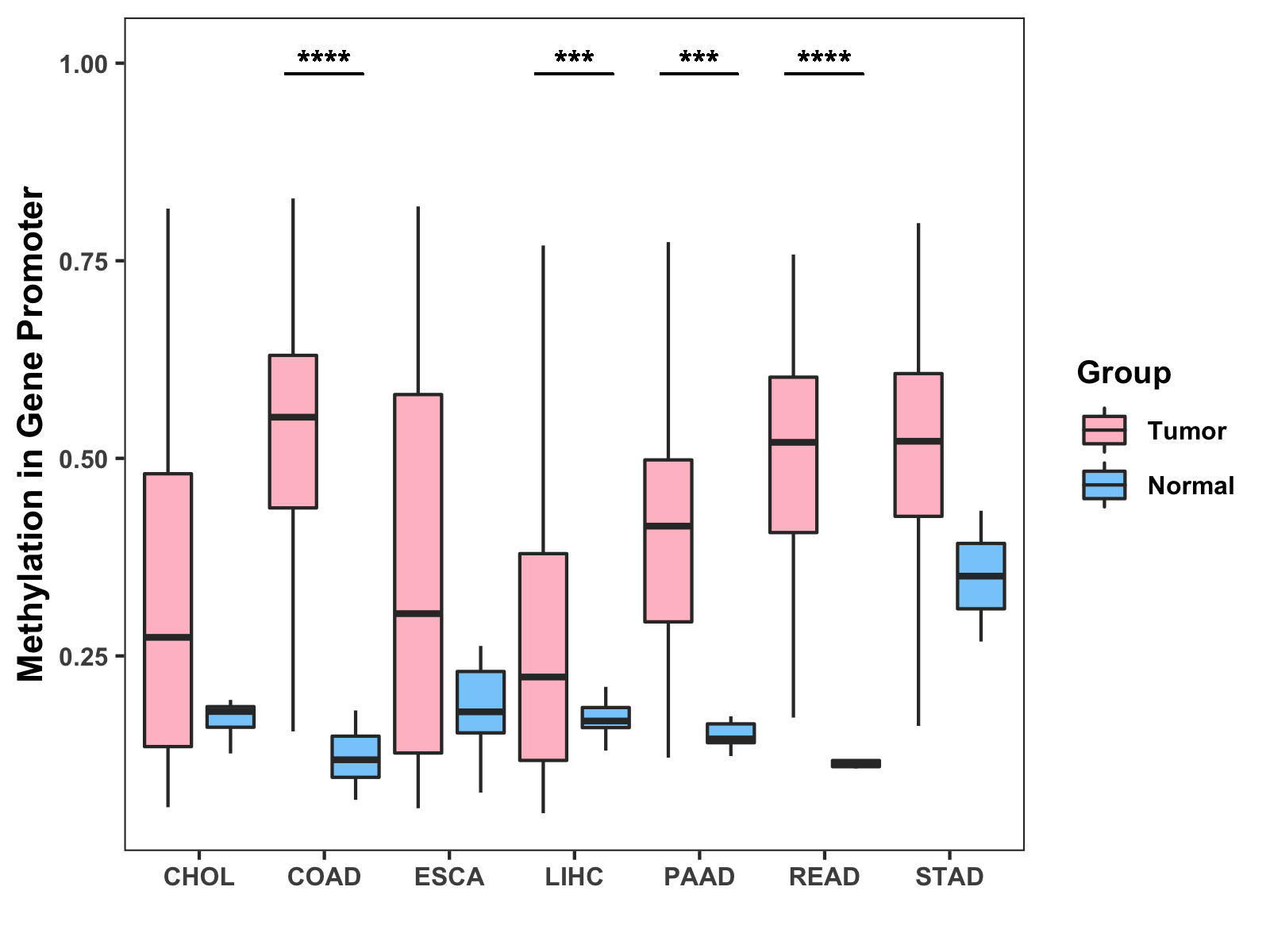 Boxplot of All Gastrointestinal Cancer ( * : 0.01-0.05 , ** : 0.005-0.01 , *** : 0.0001-0.005 , **** : < 0.0001 ) |