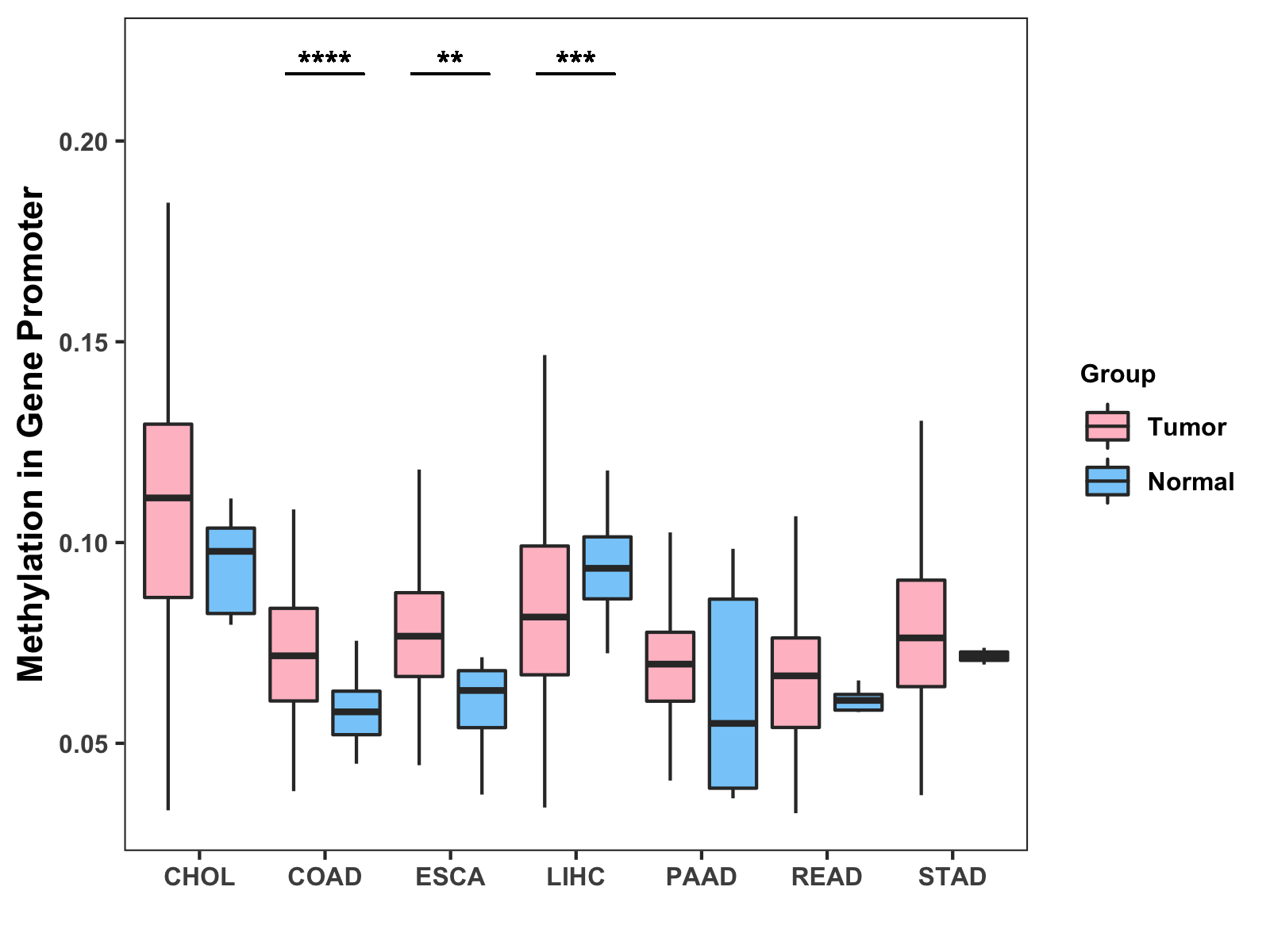 Boxplot of All Gastrointestinal Cancer ( * : 0.01-0.05 , ** : 0.005-0.01 , *** : 0.0001-0.005 , **** : < 0.0001 ) |