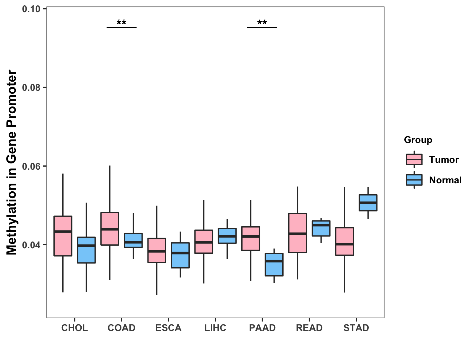 Boxplot of All Gastrointestinal Cancer ( * : 0.01-0.05 , ** : 0.005-0.01 , *** : 0.0001-0.005 , **** : < 0.0001 ) |