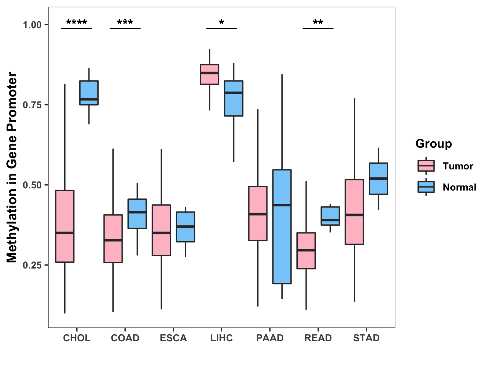 Boxplot of All Gastrointestinal Cancer ( * : 0.01-0.05 , ** : 0.005-0.01 , *** : 0.0001-0.005 , **** : < 0.0001 ) |