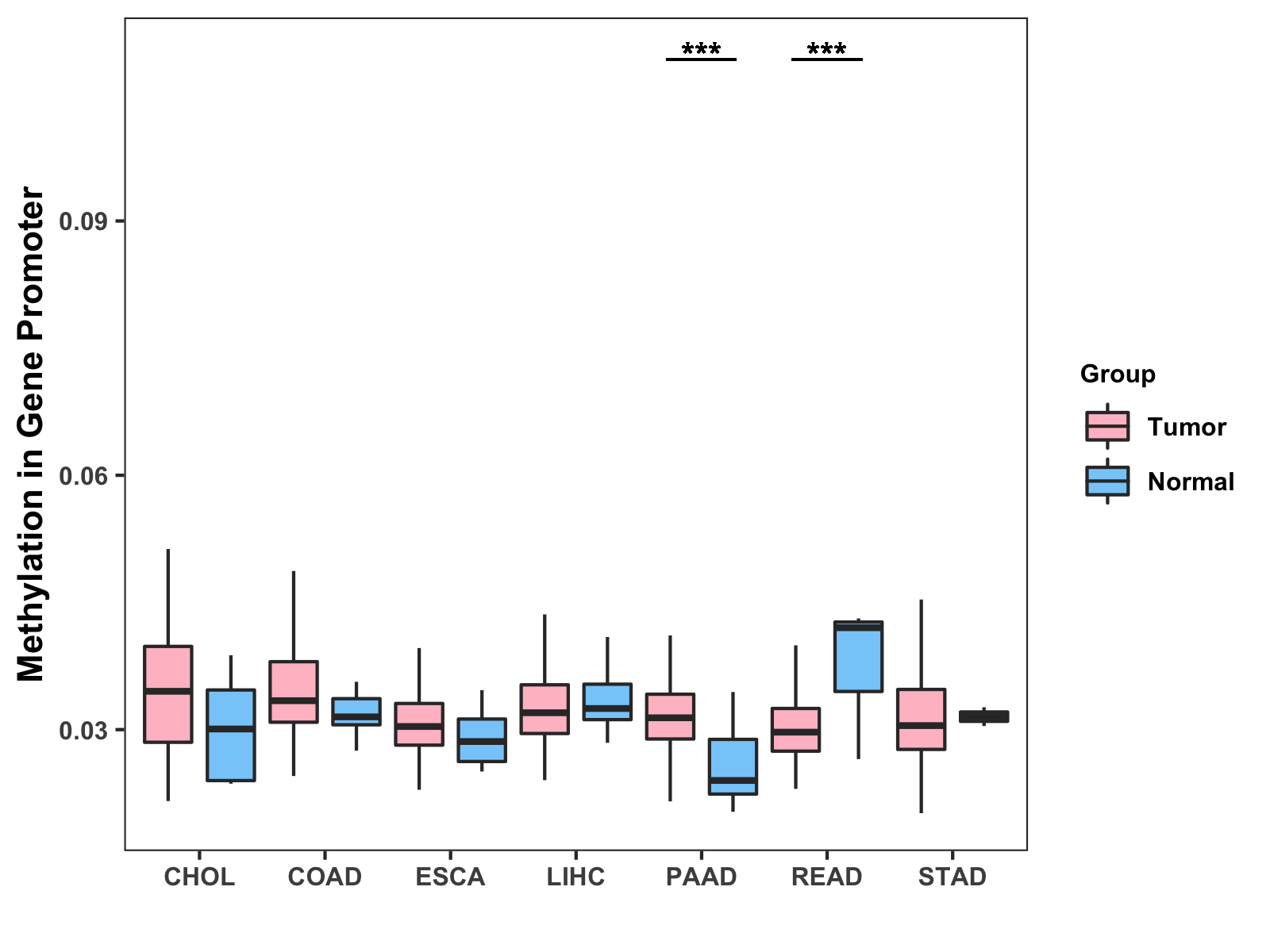 Boxplot of All Gastrointestinal Cancer ( * : 0.01-0.05 , ** : 0.005-0.01 , *** : 0.0001-0.005 , **** : < 0.0001 ) |