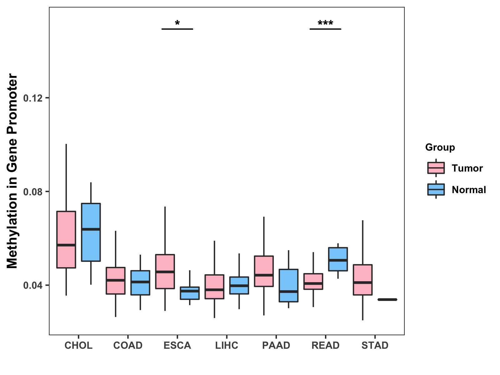 Boxplot of All Gastrointestinal Cancer ( * : 0.01-0.05 , ** : 0.005-0.01 , *** : 0.0001-0.005 , **** : < 0.0001 ) |