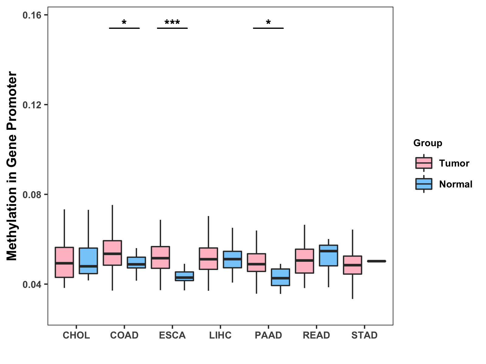Boxplot of All Gastrointestinal Cancer ( * : 0.01-0.05 , ** : 0.005-0.01 , *** : 0.0001-0.005 , **** : < 0.0001 ) |