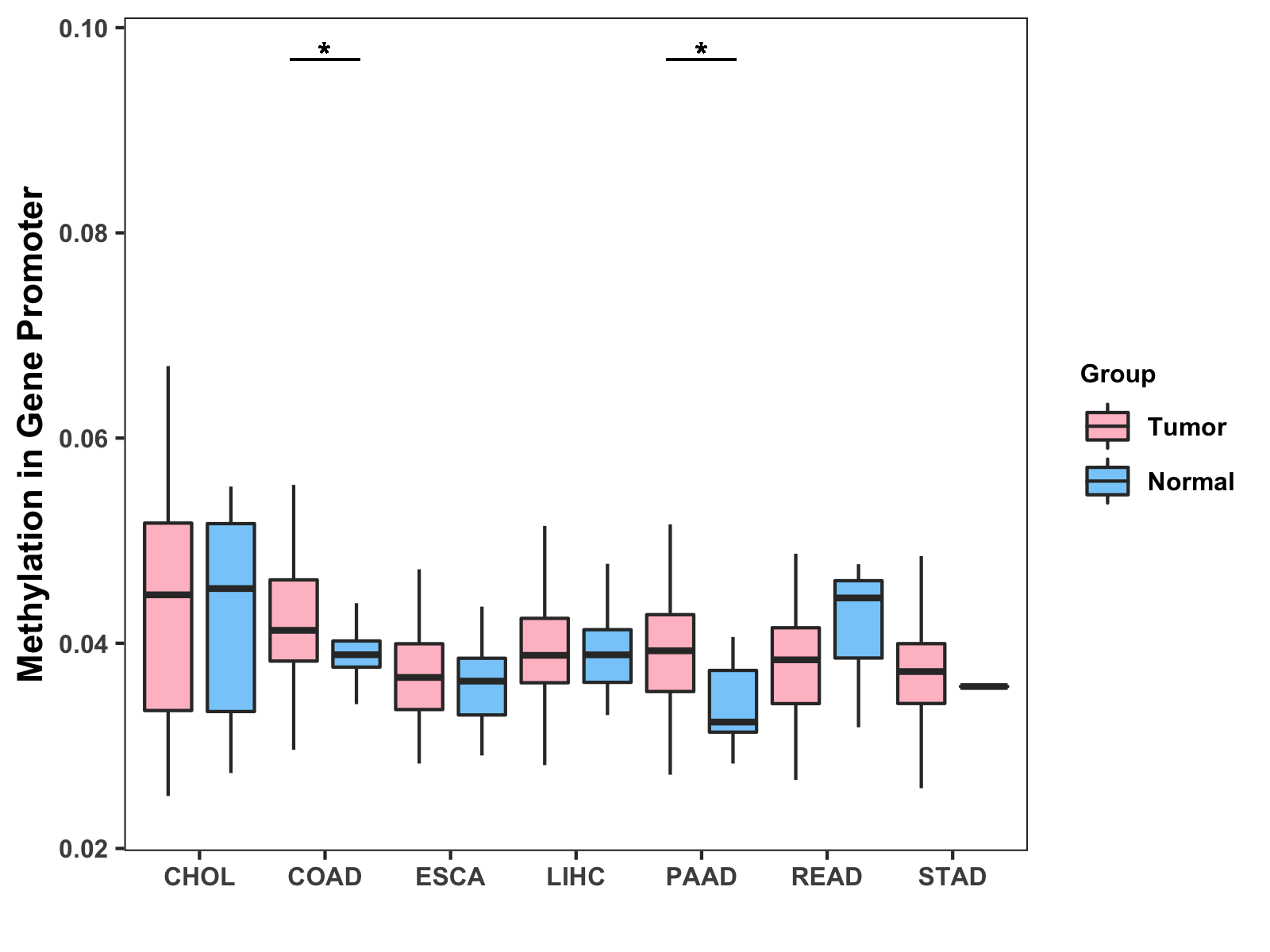 Boxplot of All Gastrointestinal Cancer ( * : 0.01-0.05 , ** : 0.005-0.01 , *** : 0.0001-0.005 , **** : < 0.0001 ) |