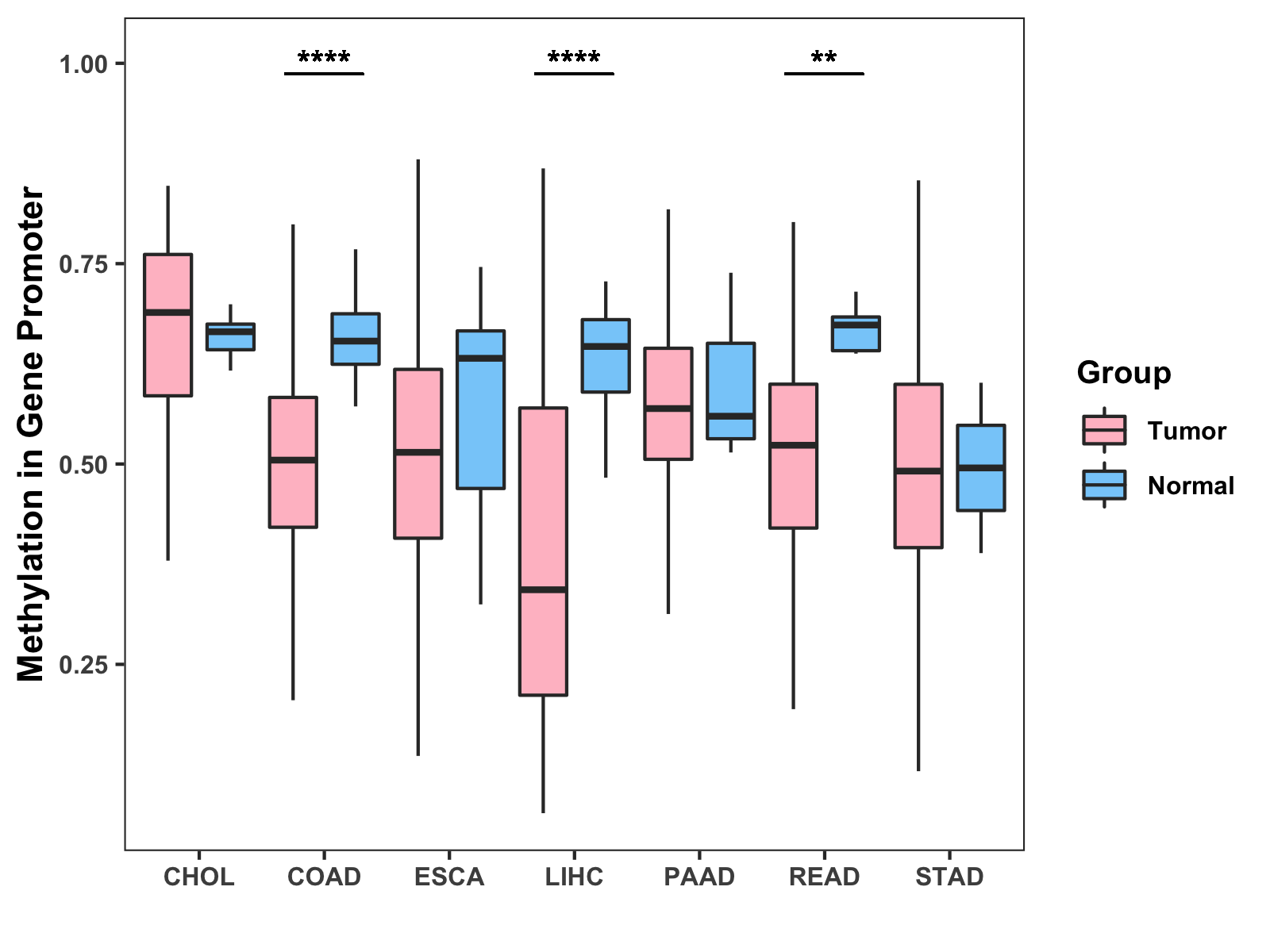 Boxplot of All Gastrointestinal Cancer ( * : 0.01-0.05 , ** : 0.005-0.01 , *** : 0.0001-0.005 , **** : < 0.0001 ) |