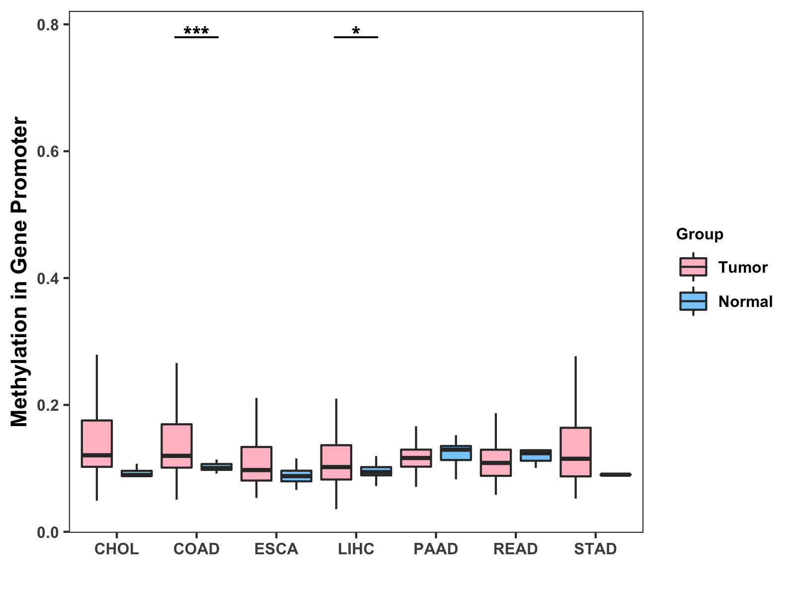 Boxplot of All Gastrointestinal Cancer ( * : 0.01-0.05 , ** : 0.005-0.01 , *** : 0.0001-0.005 , **** : < 0.0001 ) |