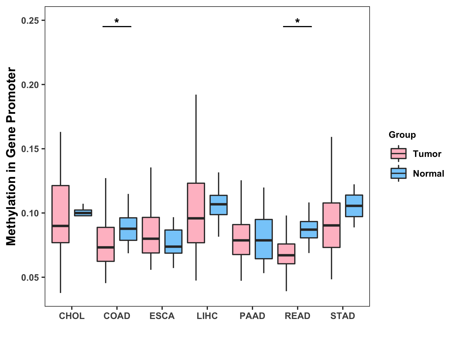 Boxplot of All Gastrointestinal Cancer ( * : 0.01-0.05 , ** : 0.005-0.01 , *** : 0.0001-0.005 , **** : < 0.0001 ) |