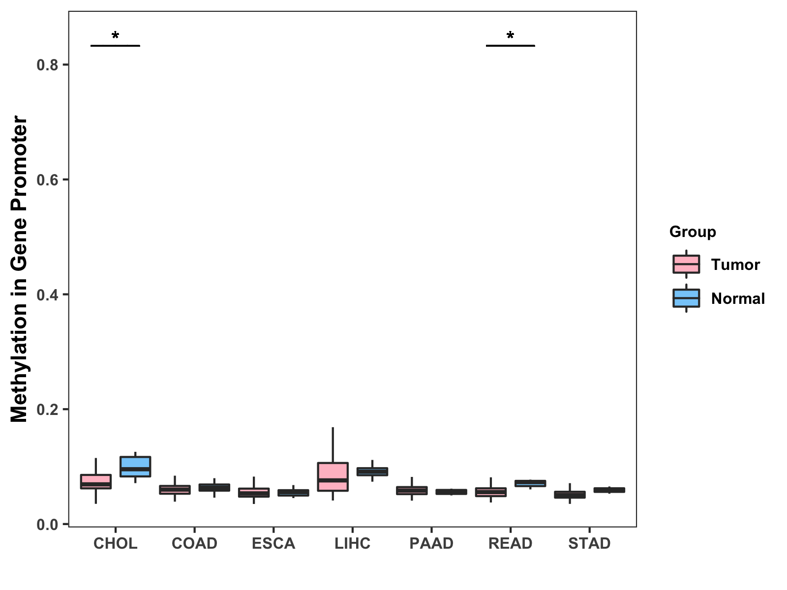 Boxplot of All Gastrointestinal Cancer ( * : 0.01-0.05 , ** : 0.005-0.01 , *** : 0.0001-0.005 , **** : < 0.0001 ) |