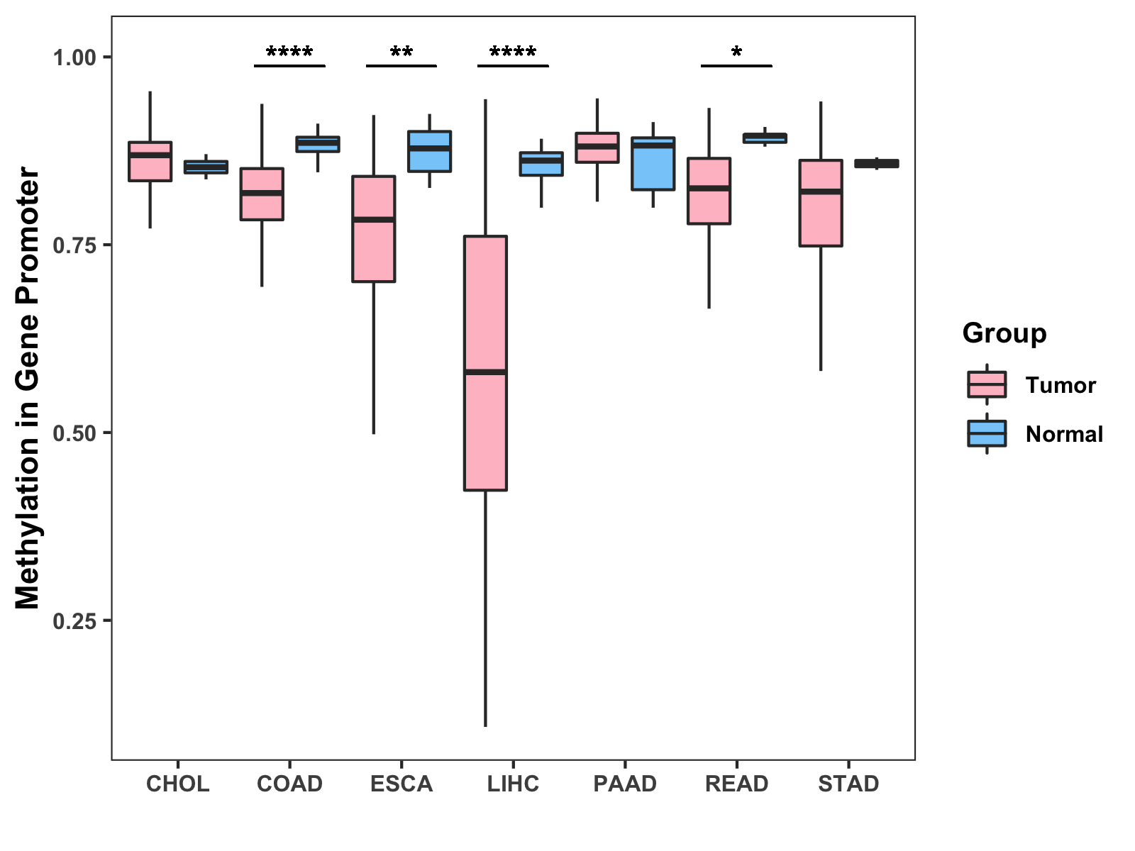 Boxplot of All Gastrointestinal Cancer ( * : 0.01-0.05 , ** : 0.005-0.01 , *** : 0.0001-0.005 , **** : < 0.0001 ) |