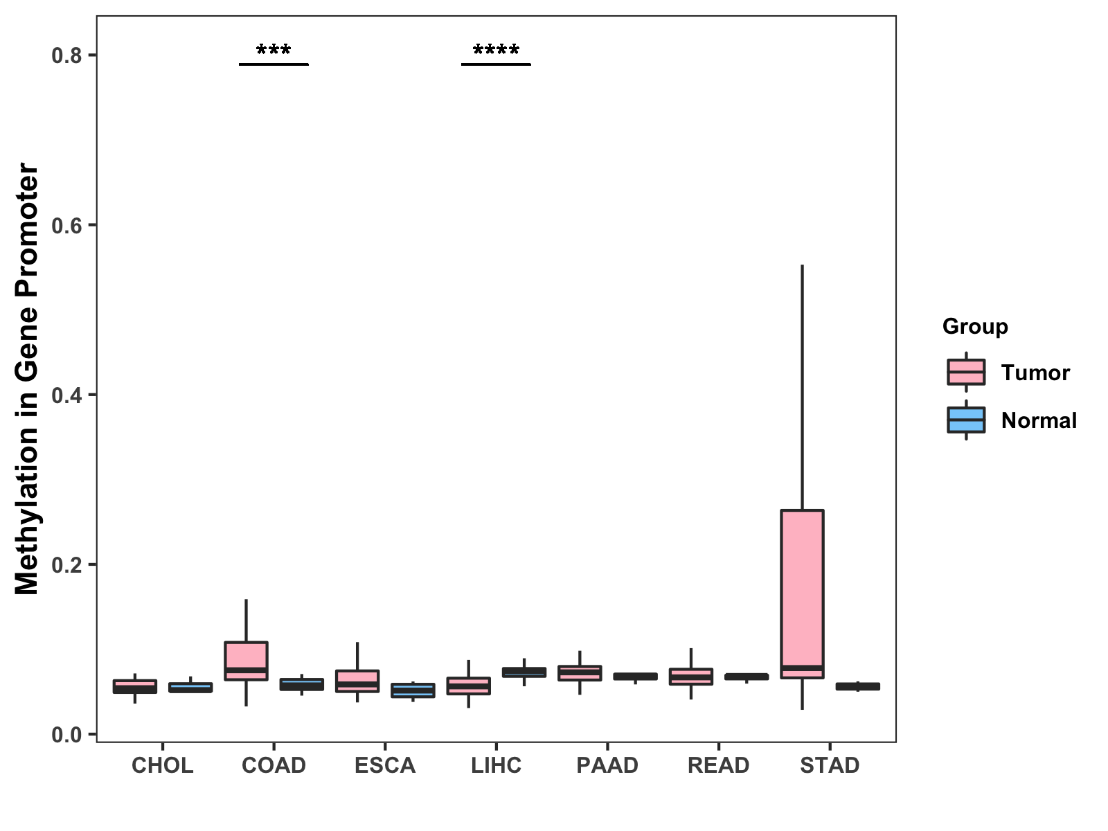 Boxplot of All Gastrointestinal Cancer ( * : 0.01-0.05 , ** : 0.005-0.01 , *** : 0.0001-0.005 , **** : < 0.0001 ) |