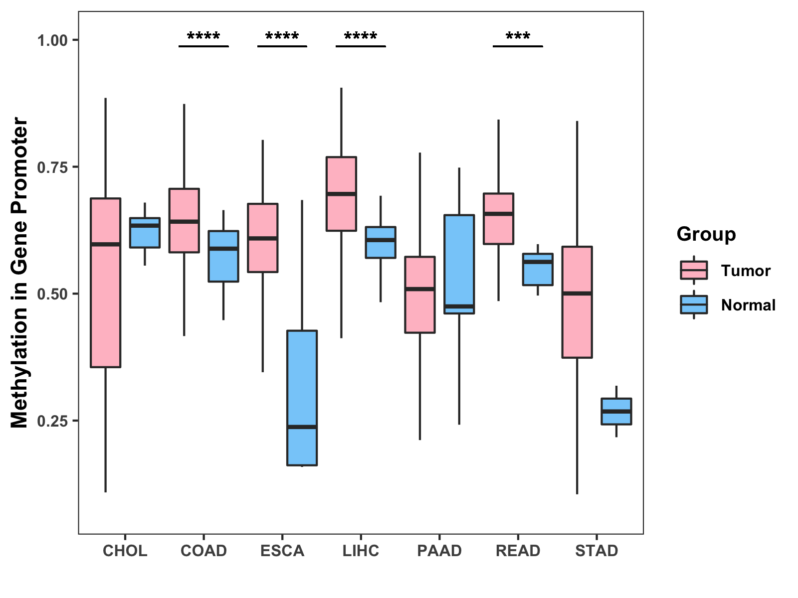 Boxplot of All Gastrointestinal Cancer ( * : 0.01-0.05 , ** : 0.005-0.01 , *** : 0.0001-0.005 , **** : < 0.0001 ) |
